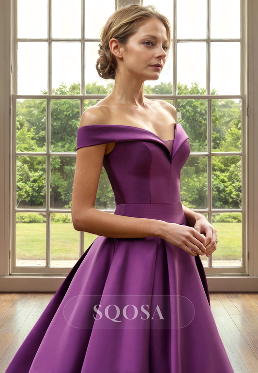 A Line Off Shoulder Satin Simple Mother of the Bride Dress Long Cocktail Dress