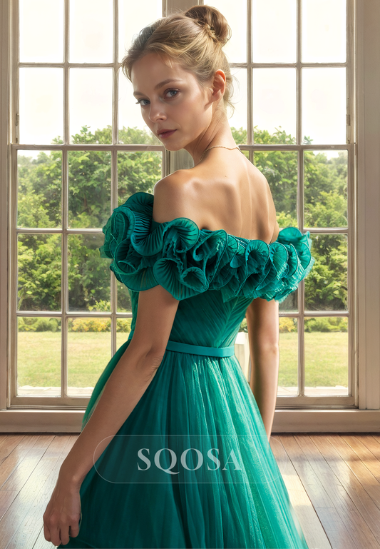 A Line Off Shoulder Tulle Green Long Cocktail Dress Elegant Mother of the Bride Dress