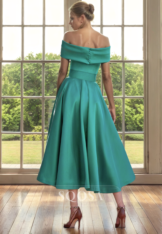 A Line Off Shoulder Satin Mother of the Bride Dress with Pockets Tea Length Cocktail Dress