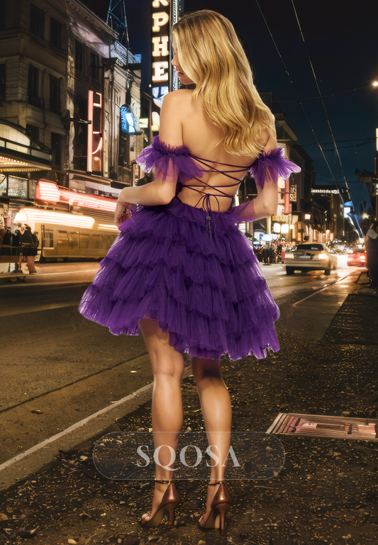 A line Off Shoulder Tulle Ruffles Short Sleeves Homecoming Dress Graduation Dress