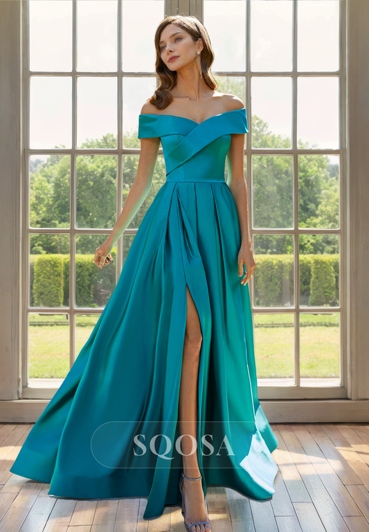 A Line Off Shoulder Satin Elegant Long Cocktail Dress with Slit Mother of the Bride Dress