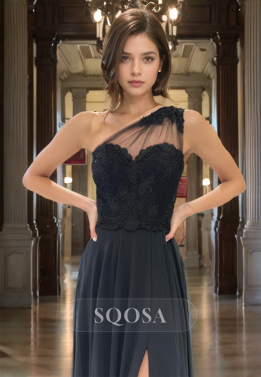 A Line One Shoulder Lace Appliques Chiffon Long Formal Evening Gown with Slit