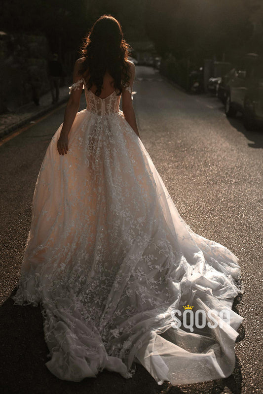 A Line Off the Shoulder Romantic Lace Wedding Dress Bridal Gown QW2272