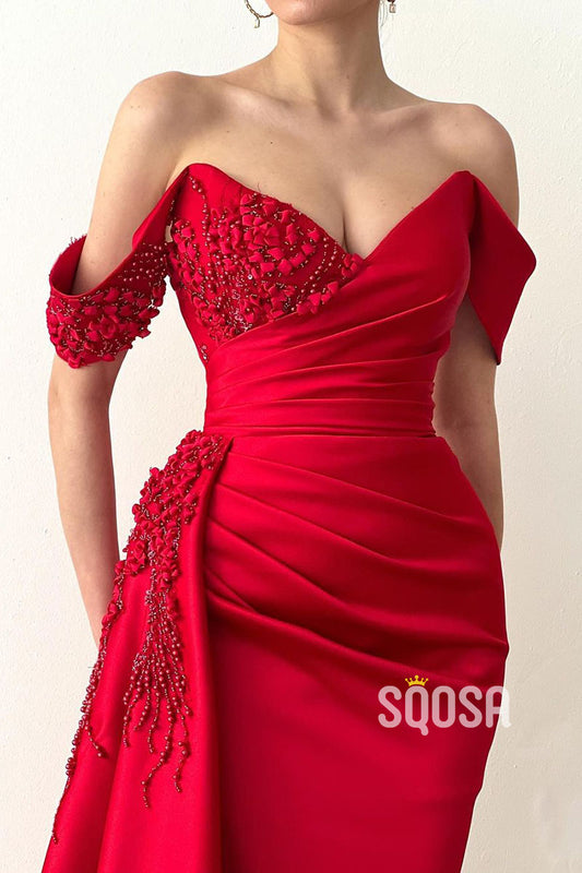 Sheath Off Shoulder Beaded Red Satin Long Prom Dress Evening Gown QP3124