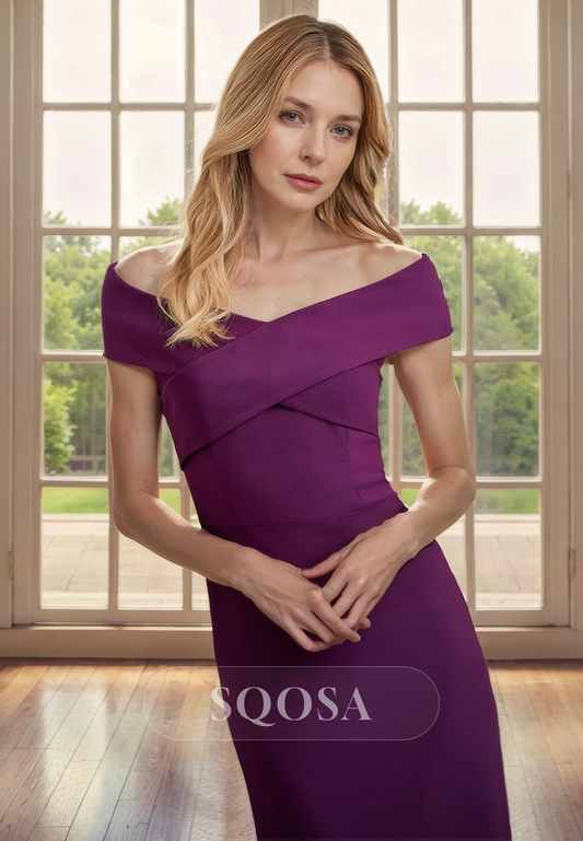 Sheath Off Shoulder Satin Pleats Elegant Cocktail Dress for Wedding Long Mother of the Bride Dress