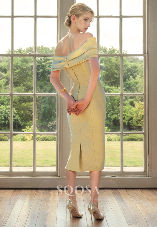 Sheath Off Shoulder Satin Pleats Elegant Mother of the Bride Dress for Wedding Short Cocktail Dress