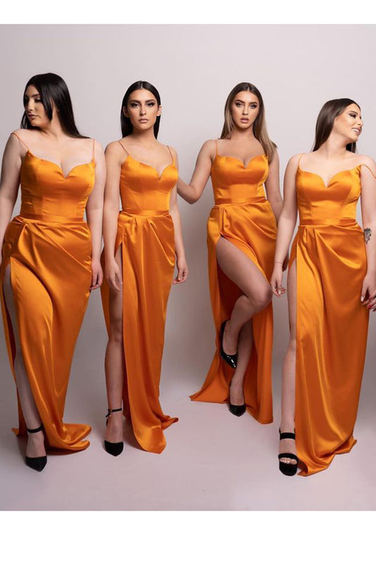 Sheath Spaghetti Straps Satin Pleated Split Long Bridesmaid Dress QB3077