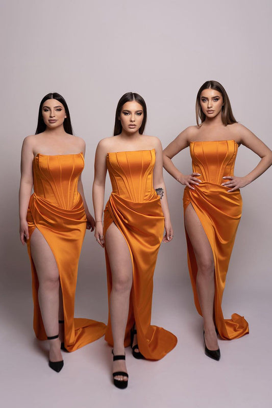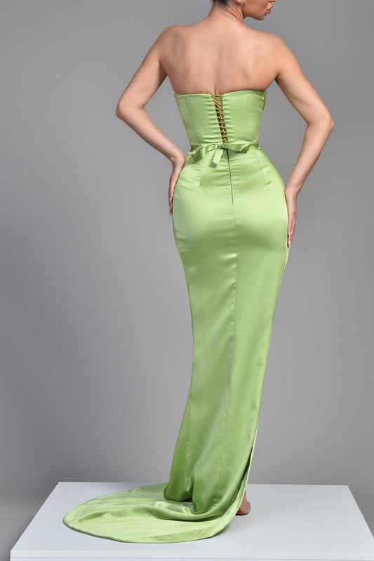 Sheath Strapless Satin Pleats Long Prom Dress with Slit Formal Dress