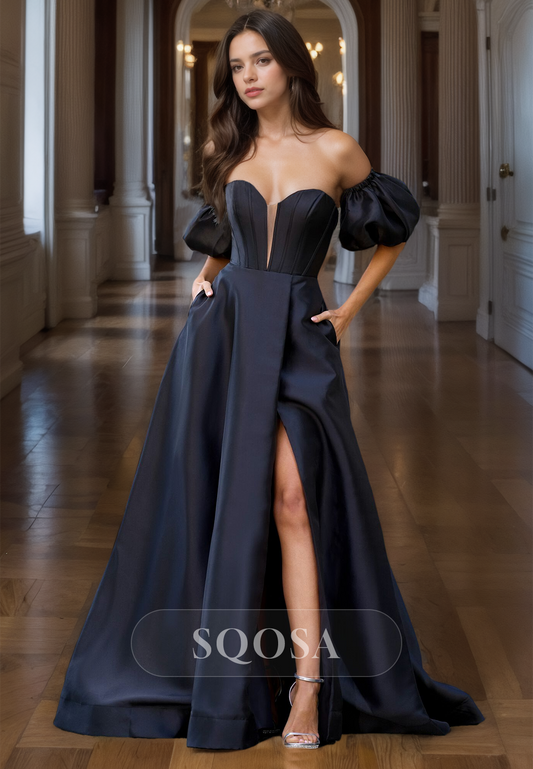 Off-Shoulder Sweetheart Sleeveless Satin Formal Gowns Pleated Cutout High Slit A-Line Prom Dress
