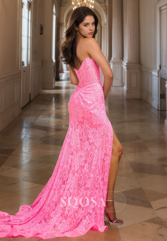 Sweetheart Beaded Lace Applique Mermaid Prom Dress Sleeveless Off-Shoulder High Slit Party Gowns