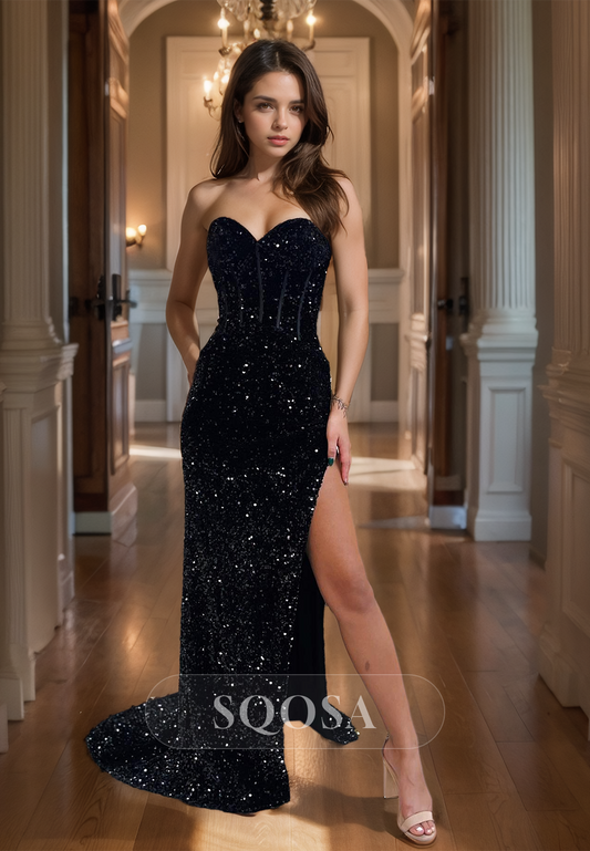 Sweetheart Sleeveless Floor-Length Mermaid Prom Dress Sequined Beaded High Slit Evening Gowns