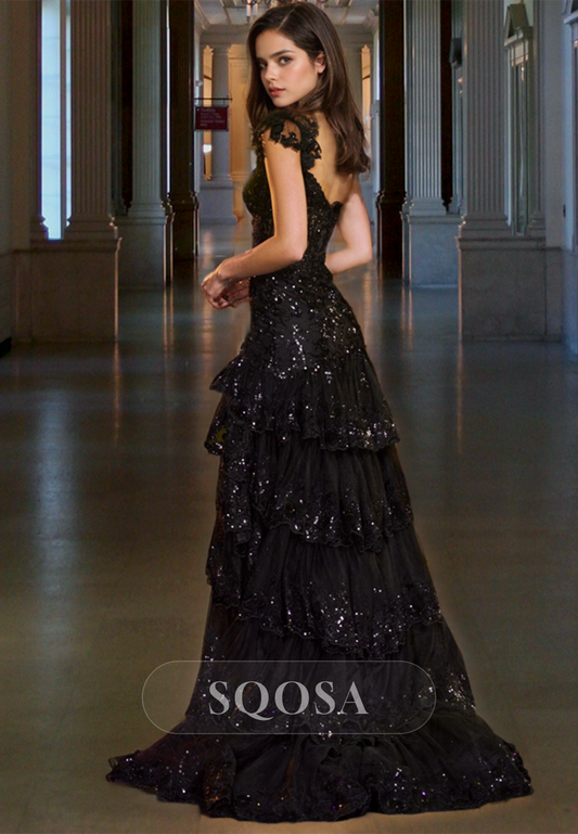 A-Line Sweetheart Sleeveless Pleated Evening Gowns Glitter-Lace Applique Tiered Prom Dress with High Slit