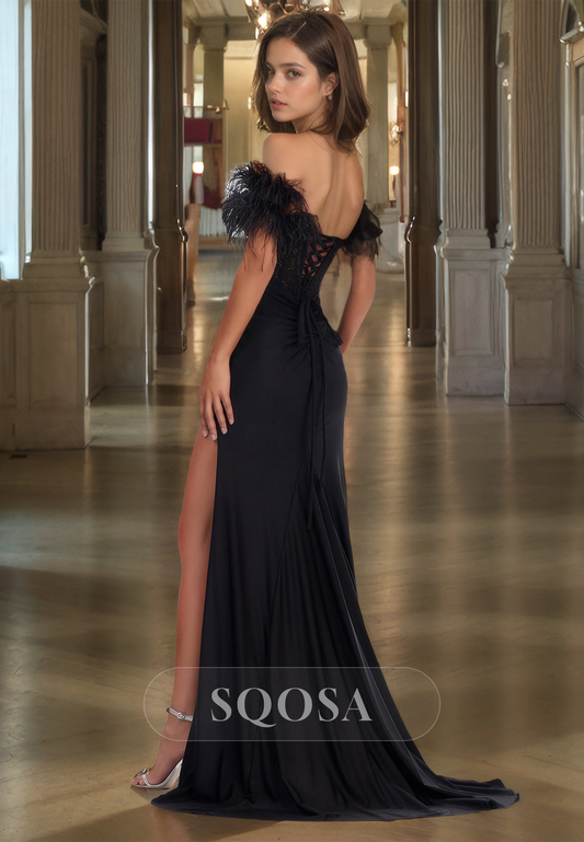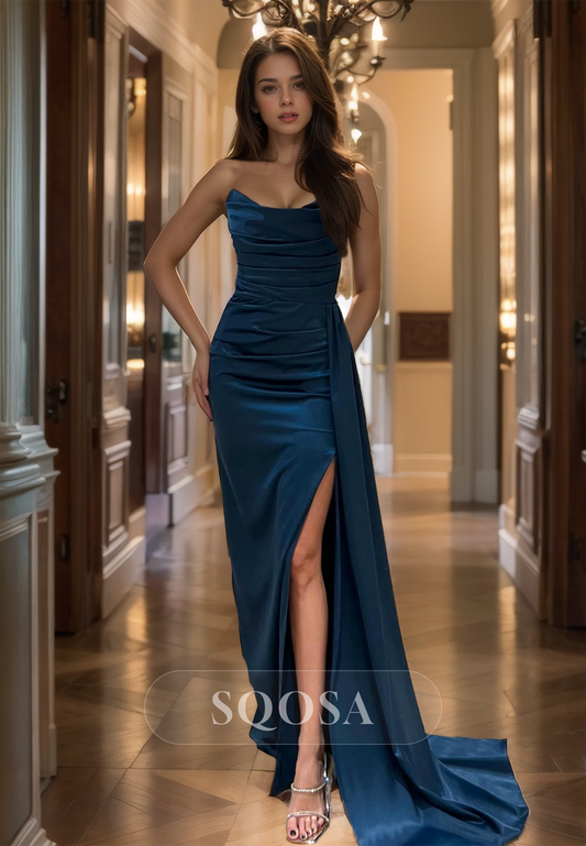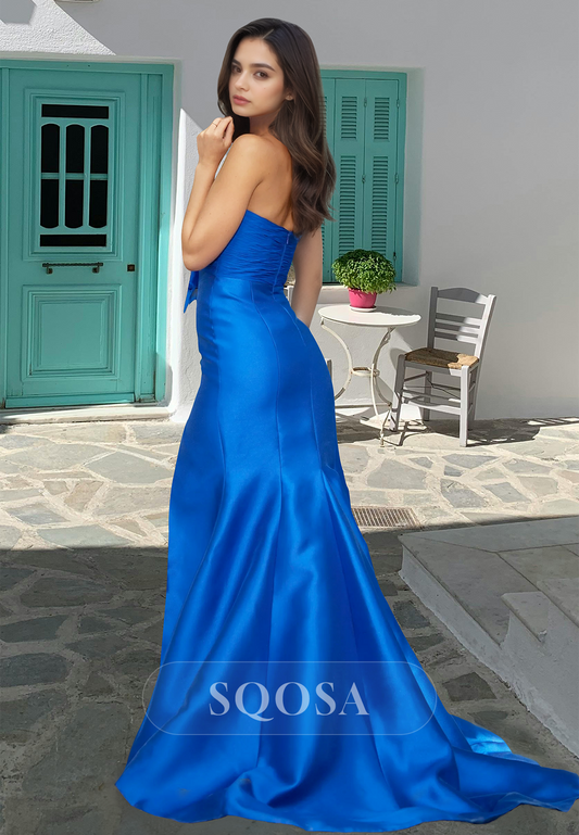 Sweetheart Off-Shoulder Pleated Mermaid Prom Dress High Slit Sweep Train Satin Evening Gowns