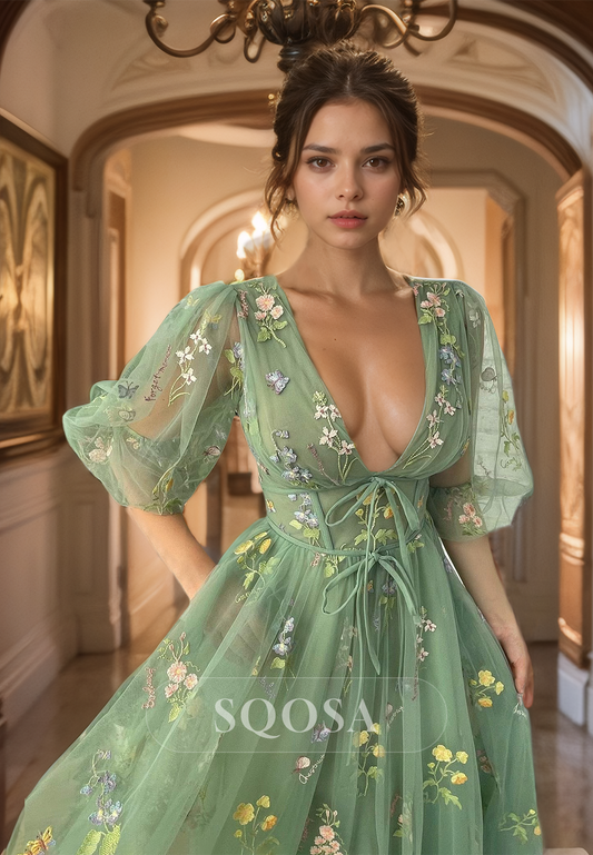 Deep V-Neck Half-Sleeves Tulle A-Line Prom Dress Embroidered Pleated Midi Party Gowns