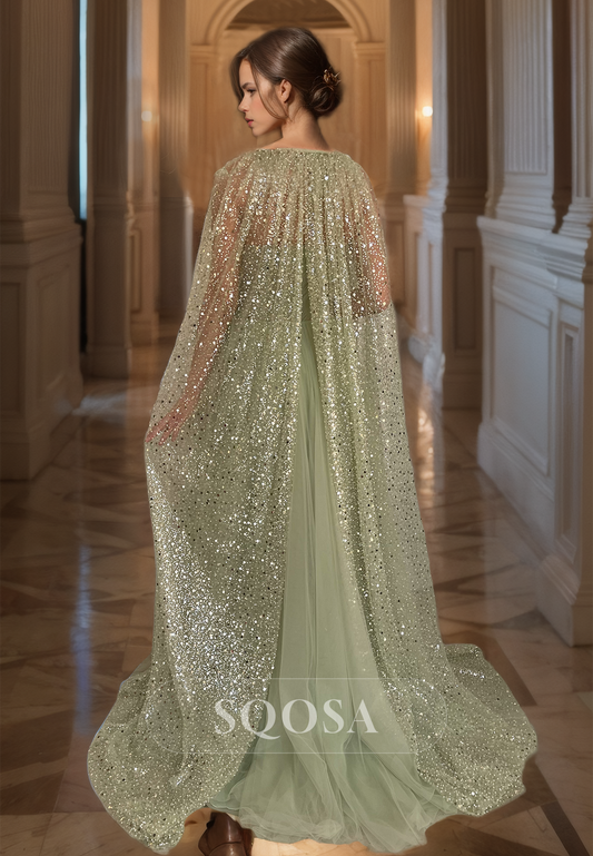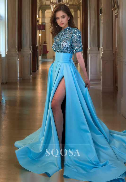 High-Neck Half-Sleeves Beaded Sequins Party Gowns Pleated High Slit A-Line Prom Dress with Train