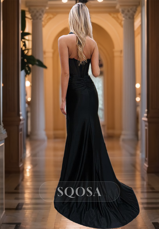 Halter Deep V-Neck Off-Shoulder Sleeveless Pleated Slit Mermaid Prom Dress with Sweep Train