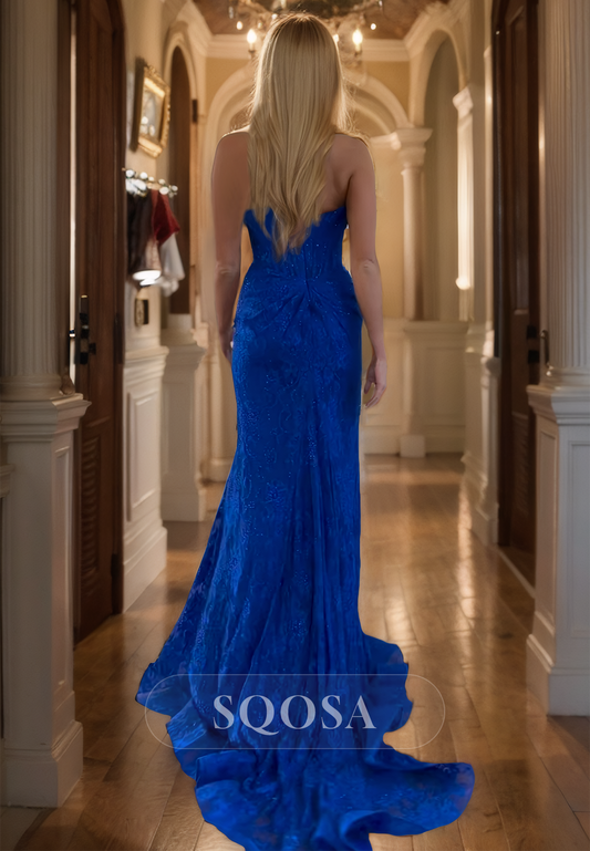 Sleeveless Off-Shoulder Sweetheart Mermaid Prom Dress Allover Lace Applique High Slit Party Gowns