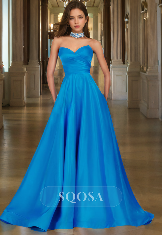 A-Line Sweetheart Off-Shoulder Sleeveless Prom Dress Beaded Pleated Satin Evening Gowns