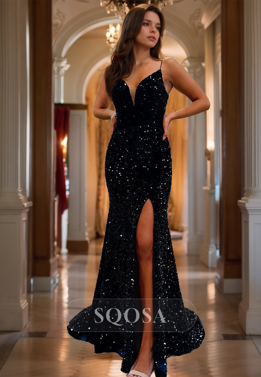 Deep V-Neck Spaghetti Straps Mermaid Prom Dress Sequined Glitter-Knit Sweep Train Party Gowns with High Slit