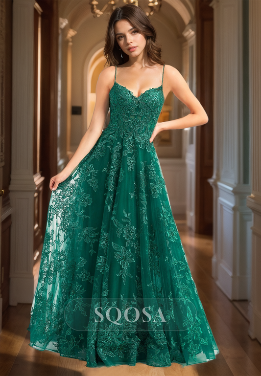 A-Line V-Neck Spaghetti Straps Sleeveless Prom Dress Off-Shoulder Lace Applique Cutout Formal Gowns