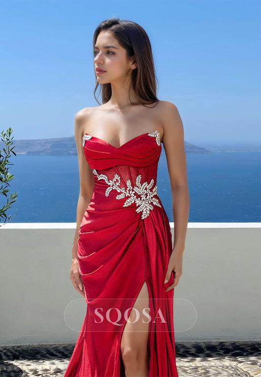 Floral Embossed Sweetheart Satin Mermaid Prom Dress Sleeveless Pleated High Slit Evening Gowns