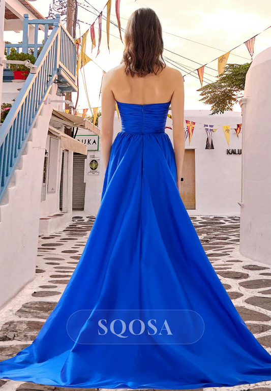 Sweetheart Sleeveless Satin Fitted Prom Dress Pleated High Slit Evening Gowns with Sweep Train