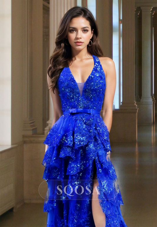 Halter Deep V-Neck Off-Shoulder Sleeveless Party Gowns Glitter-Knit Lace Applique Tiered A-Line Prom Dress
