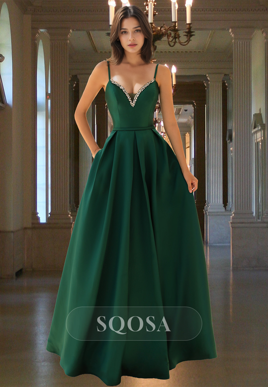 Beaded V-Neck Spaghetti Straps Pleated A-Line Prom Dress Off-Shoulder Sleeveless Satin Party Gowns