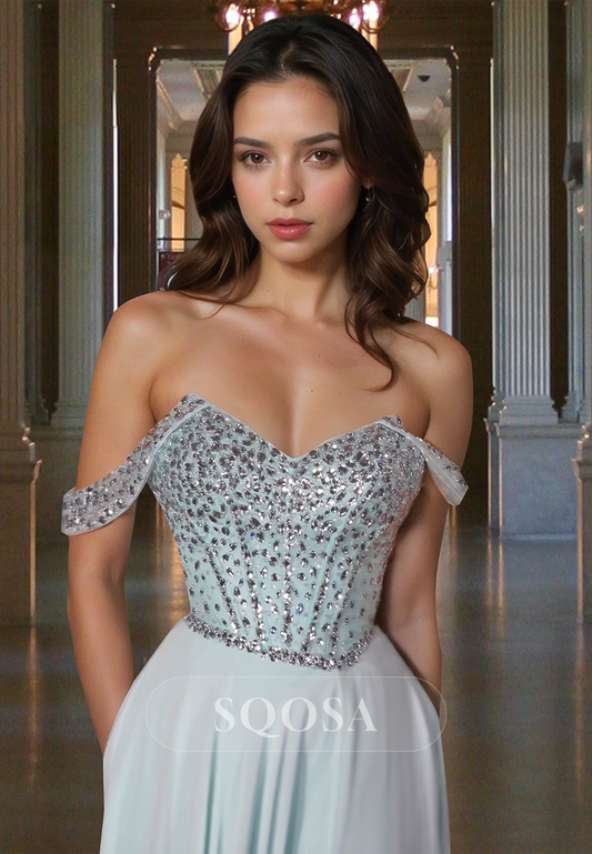 Spaghetti Straps Off-Shoulder Beaded Tulle High Slit Formal Gowns Sweetheart Sleeveless A-Line Prom Dress