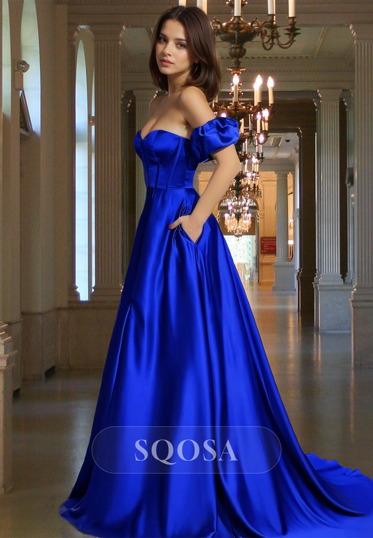 Off-Shoulder Sweetheart Pleated A-Line Prom Dress Puff-Sleeves High Slit Satin Evening Gowns