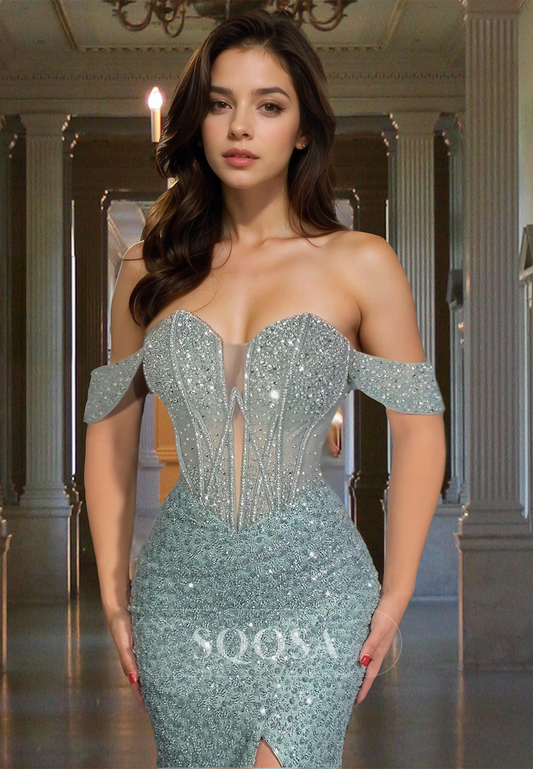Fully Beaded Sequined Sweetheart Sleeveless Party Gowns Off-Shoulder Pleated Cutout Slit Mermiad Prom Dress