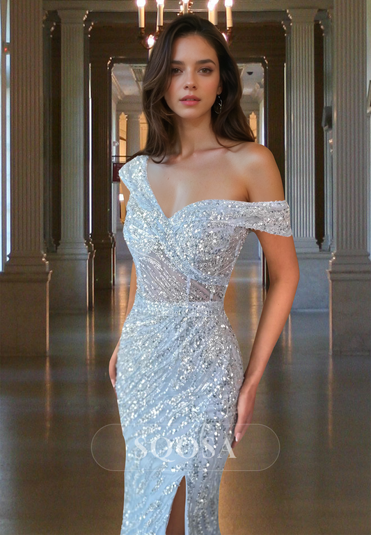 One-Strap Off-Shoulder Sleeveless Party Gowns Beaded Sweetheart Pleated A-Line Prom Dress with Slit