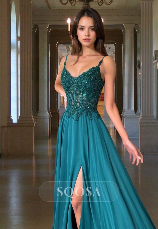 Spaghetti Straps V-Neck Sleeveless A-Line Prom Dress Off-Shoulder Beaded Applique Chiffon Formal Gowns