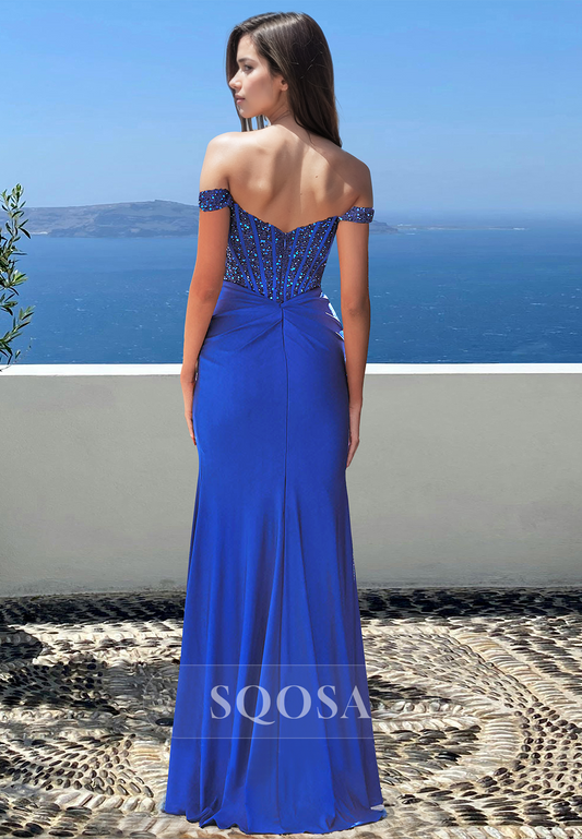Scoop-Neck Off-Shoulder Sleeveless Party Gowns Beaded Pleated Mermaid Prom Dress with High Slit