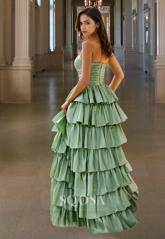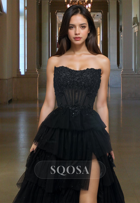Tube Top Sleeveless Pleated A-Line Prom Dress Off-Shoulder Tiered Evening Gowns with High Slit