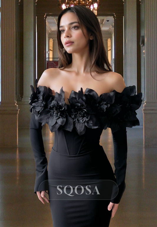 Tube Top Long-Sleeves Beaded Evening Gowns Off-Shoulder Floral Embossed Mermaid Prom Dress
