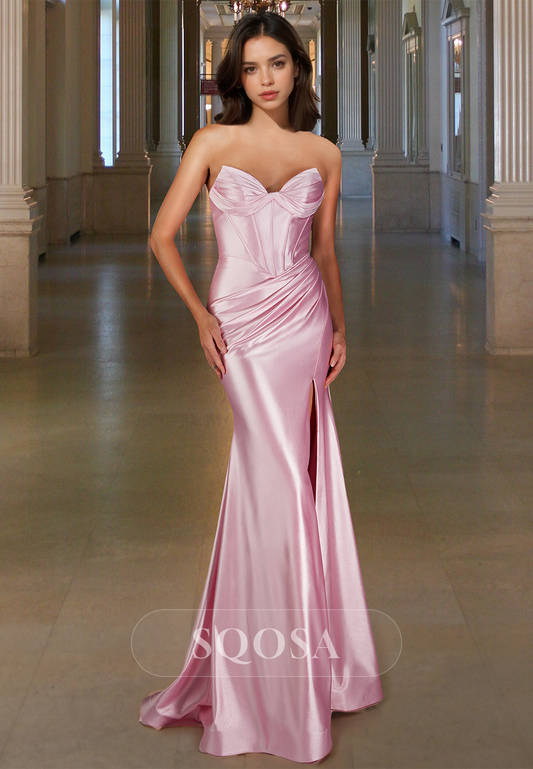 Strapless Sweetheart Sleeveless Fitted Prom Dress Pleated Beaded Applique High Slit Formal Gowns