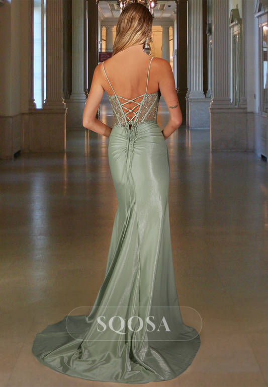 V-Neck Spaghetti Straps Off-Shoulder Mermaid Prom Dress Sleeveless Pleated Beaded Formal Gowns with Slit