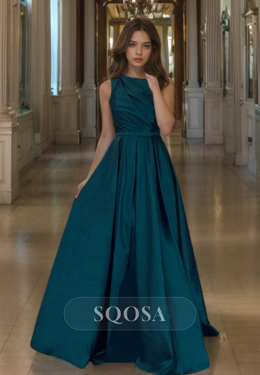 Asymmetrical-Neck Off-Shoulder Sleeveless A-Line Prom Dress Pleated Satin Bride Gowns with Slit