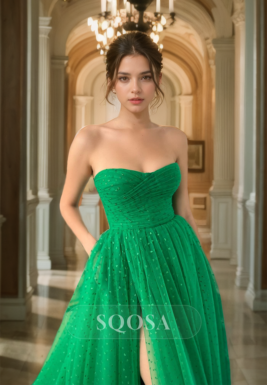 Sweetheart Strapless Satin Pleated Long Prom Dress Sleeveless High Slit Formal Gowns