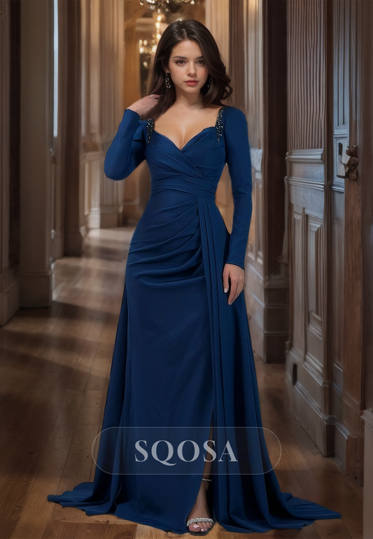 Sweetheart Long Sleeves Fitted Prom Dress Slit Pleated Satin Prom Dress with Beaded Formal Gowns