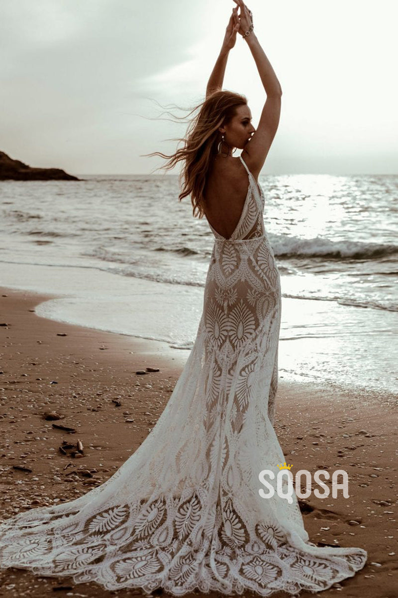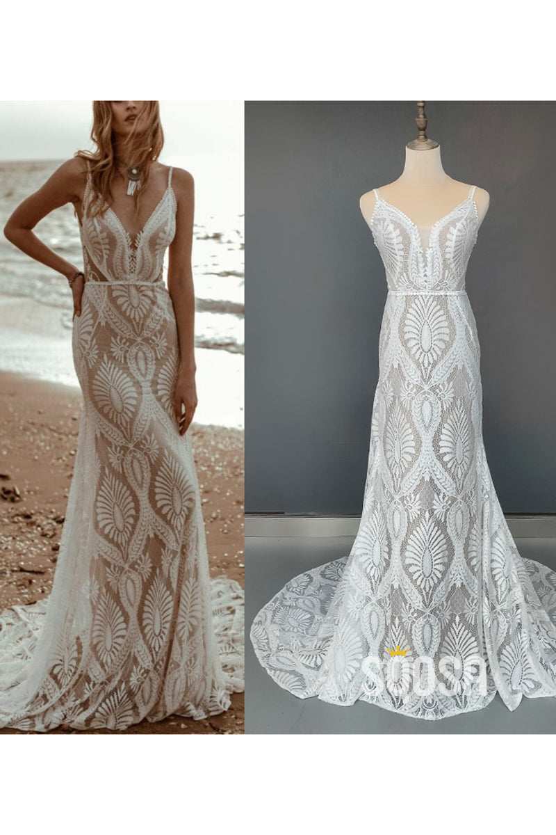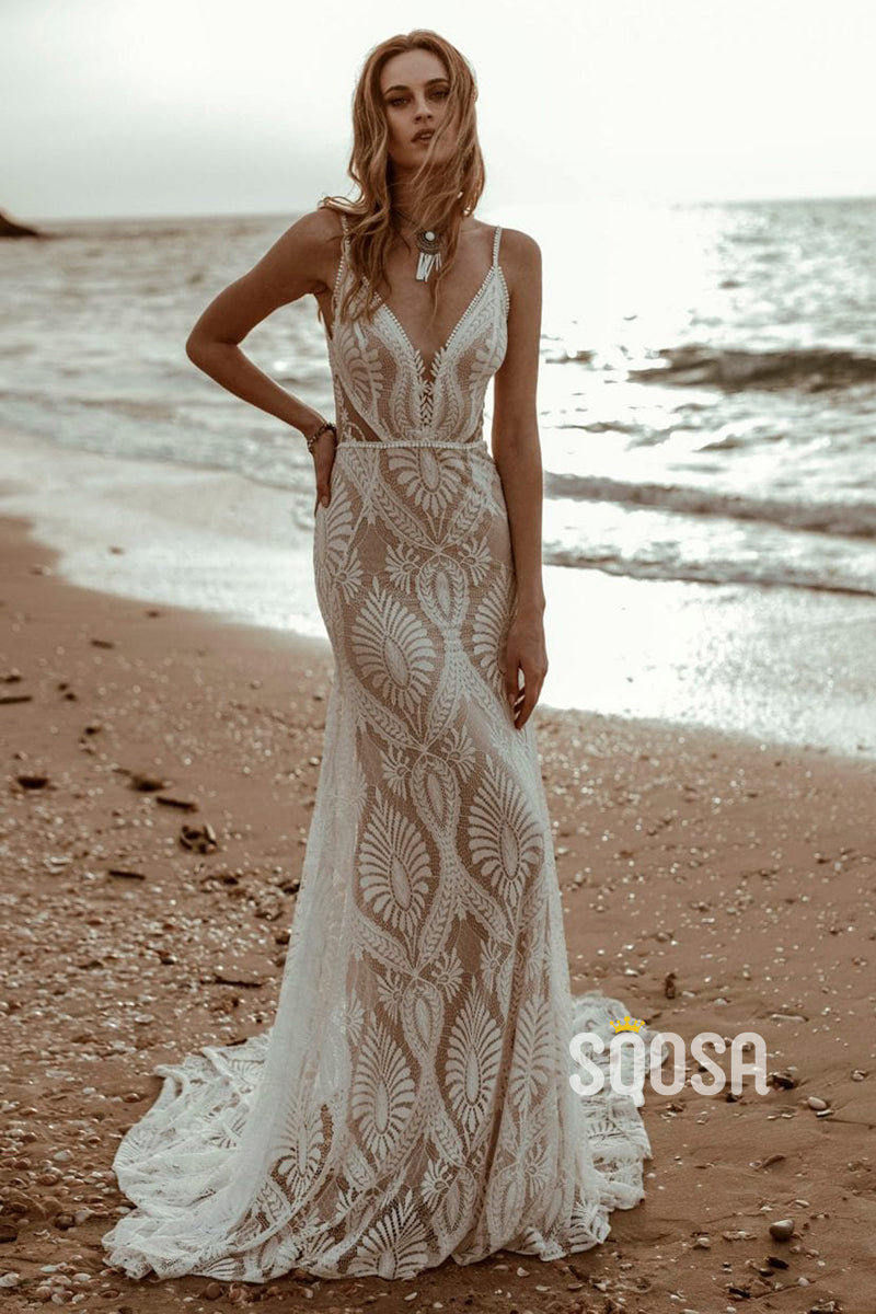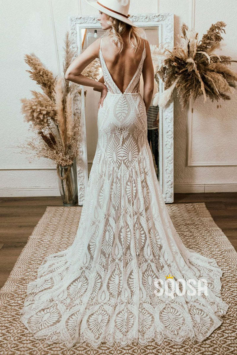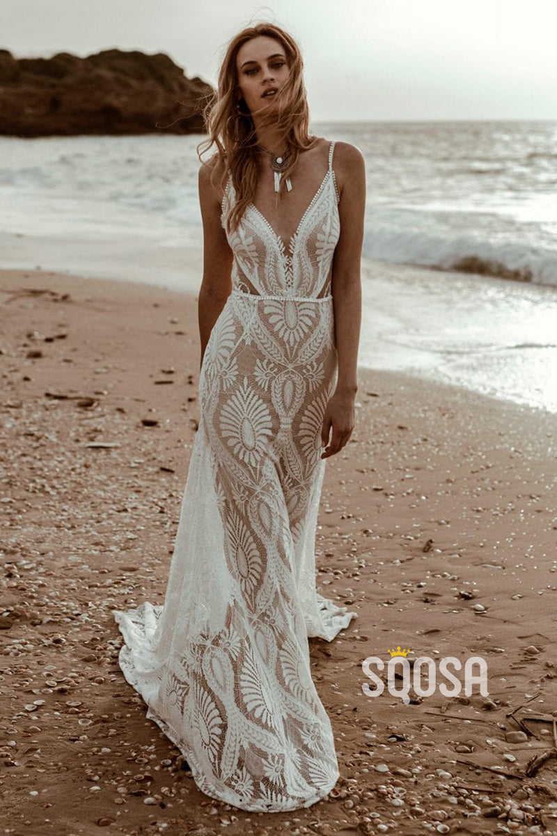 Plunging V-Neck Sheath Lace Bohemian Wedding Dress QW2135