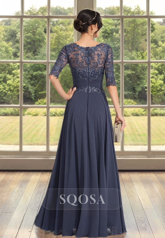 Scoop-Neck Half-Sleeves Cocktail Gowns Beaded Applique Pleated Mother of the Bride Dress with Slit