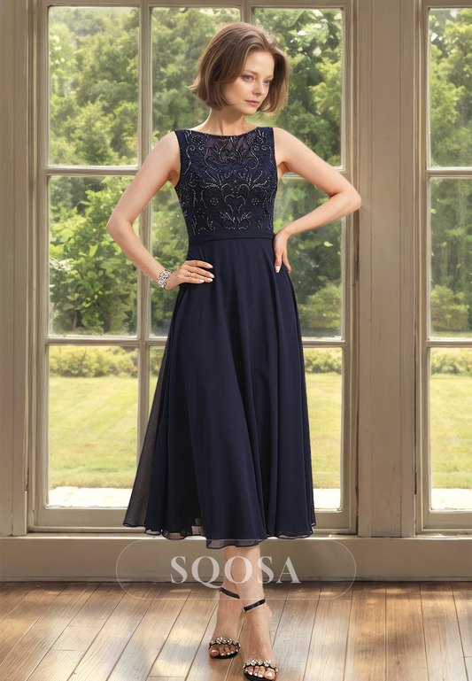 Scoop-Neck Long-Sleeves Chiffon A-Line Mother of the Bride Gowns Lace Applique Beaded Sheer Cocktail Dress