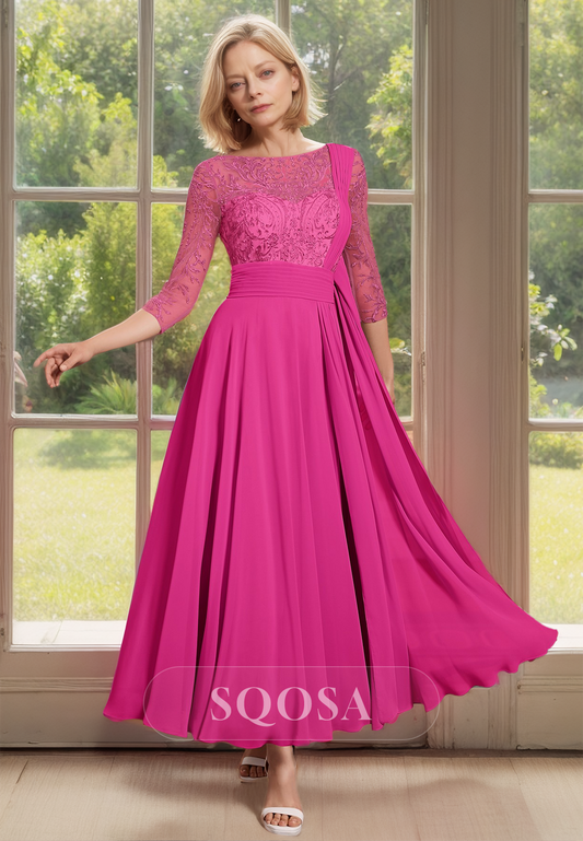 Scoop-Neck 3/4 Sleeves Lace Blouson Mother of the Bride Dress for Wedding Pleated Fitted Cocktail Gowns
