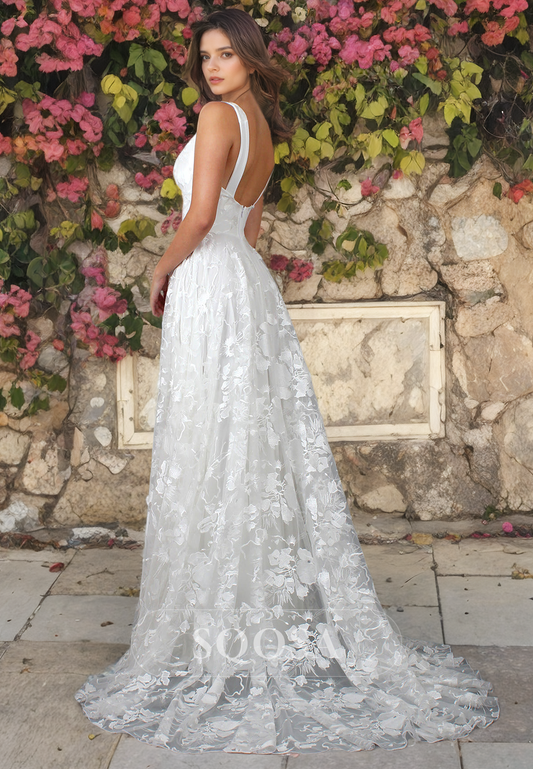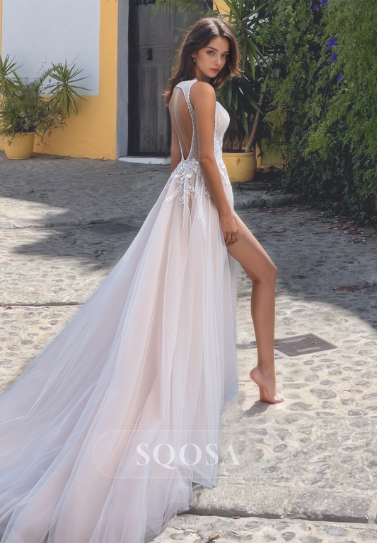A-Line V-Neck Sleeveless Lace Beach Wedding Dress High Slit with Train Boho Wedding Dress