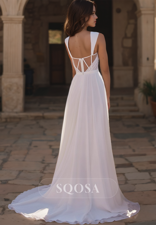 Simple Square-Neck Straps Sleeveless A-Line Chiffon with Sweep Train Beach Wedding Dress