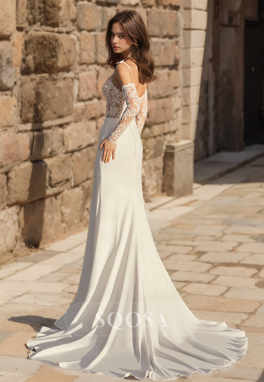 V-Neck Sleeveless Straps Boho Wedding Dress with Lace Train Off-Shoulder Mermaid Bridal Dress