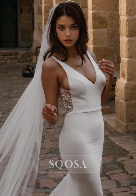 V-Neck Sleeveless Off-Shoulder Straps Applique Cutout Mermaid Wedding Dress with Lace Train