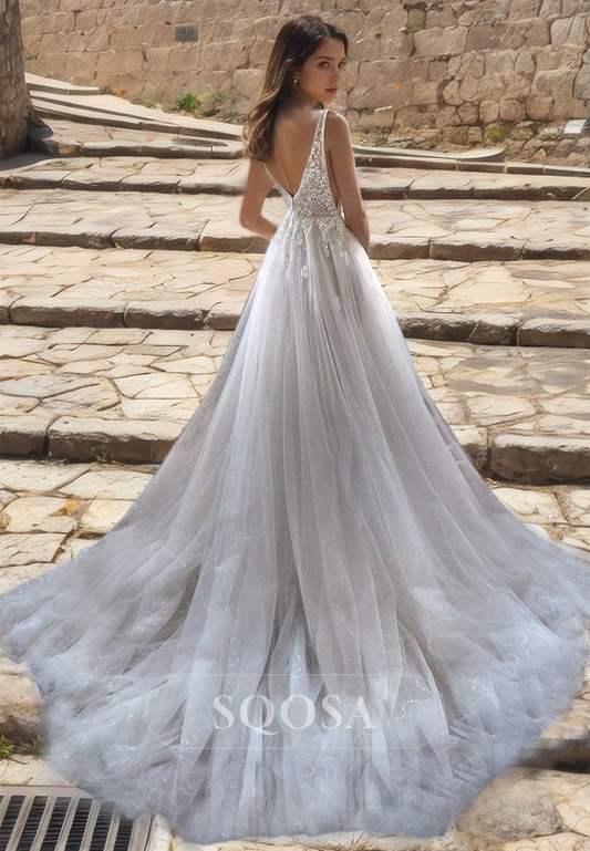 V-Neck Spaghetti Straps Sleeveless Allover Glitter Lace A-Line Wedding Dress with Sweep Train